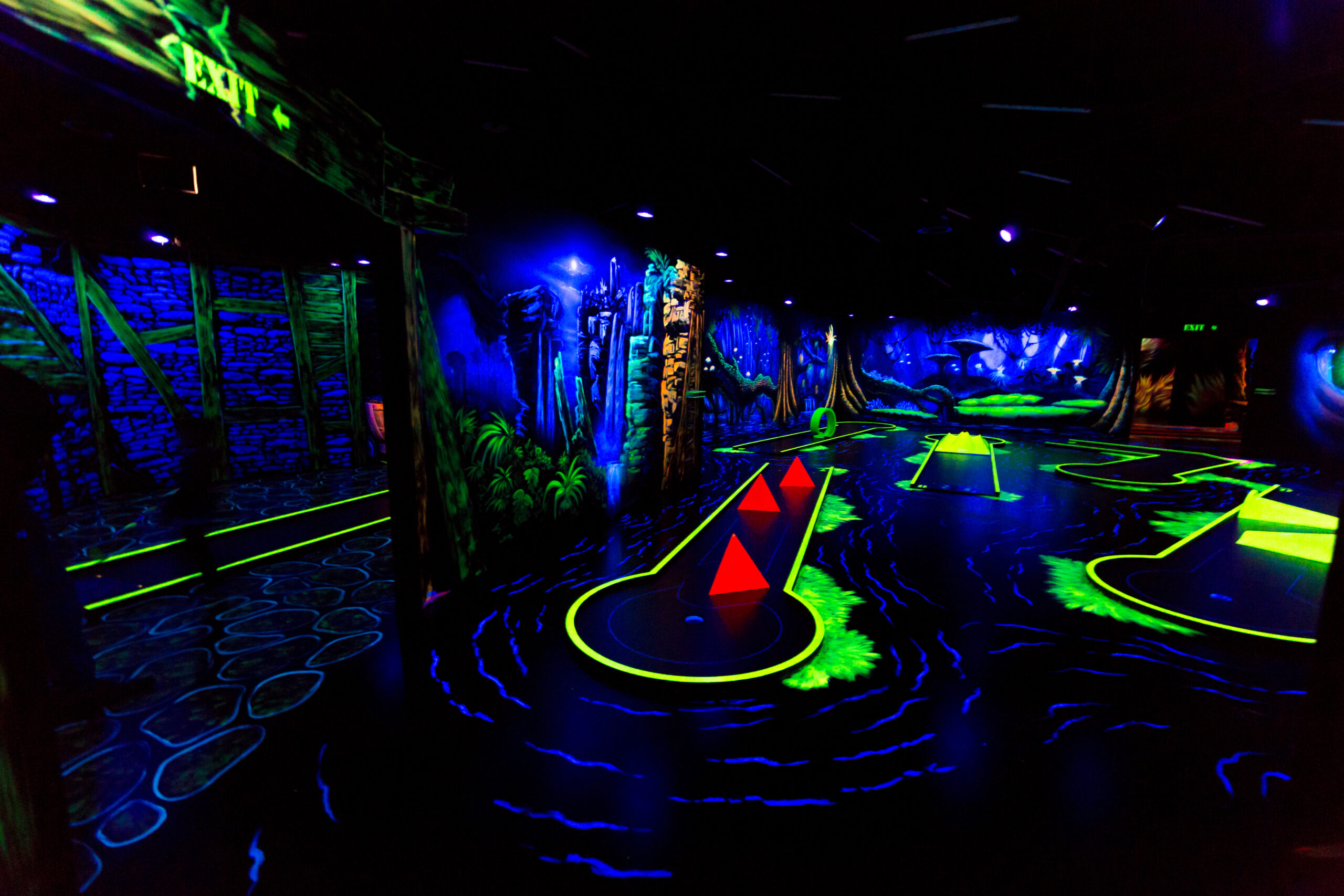 Entfliehen Sie dem Alltag und begeben Sie sich auf eine einzigartige Reise durch eine geheimnisvoll leuchtende Fantasiewelt, bestehend aus verschiedenen atemberaubenden und detailreich gestalteten Landschaften und Kulissen. Erkunden Sie wie ein Cowboy den wilden Westen, indem Sie verrückte Hindernisse bezwingen und optische Sinnestäuschungen erleben. Tauchen Sie ein, erforschen Sie die Unterwasserwelt des Atlantiks und begegnen Sie einem Riesenkraken. Welche Überraschungen, Welten und Landschaften Sie auf dieser geheimnisvollen Reise noch erwarten, das können Sie täglich in der Extreme Minigolf Arena in Schweinfurt selbst herausfinden.