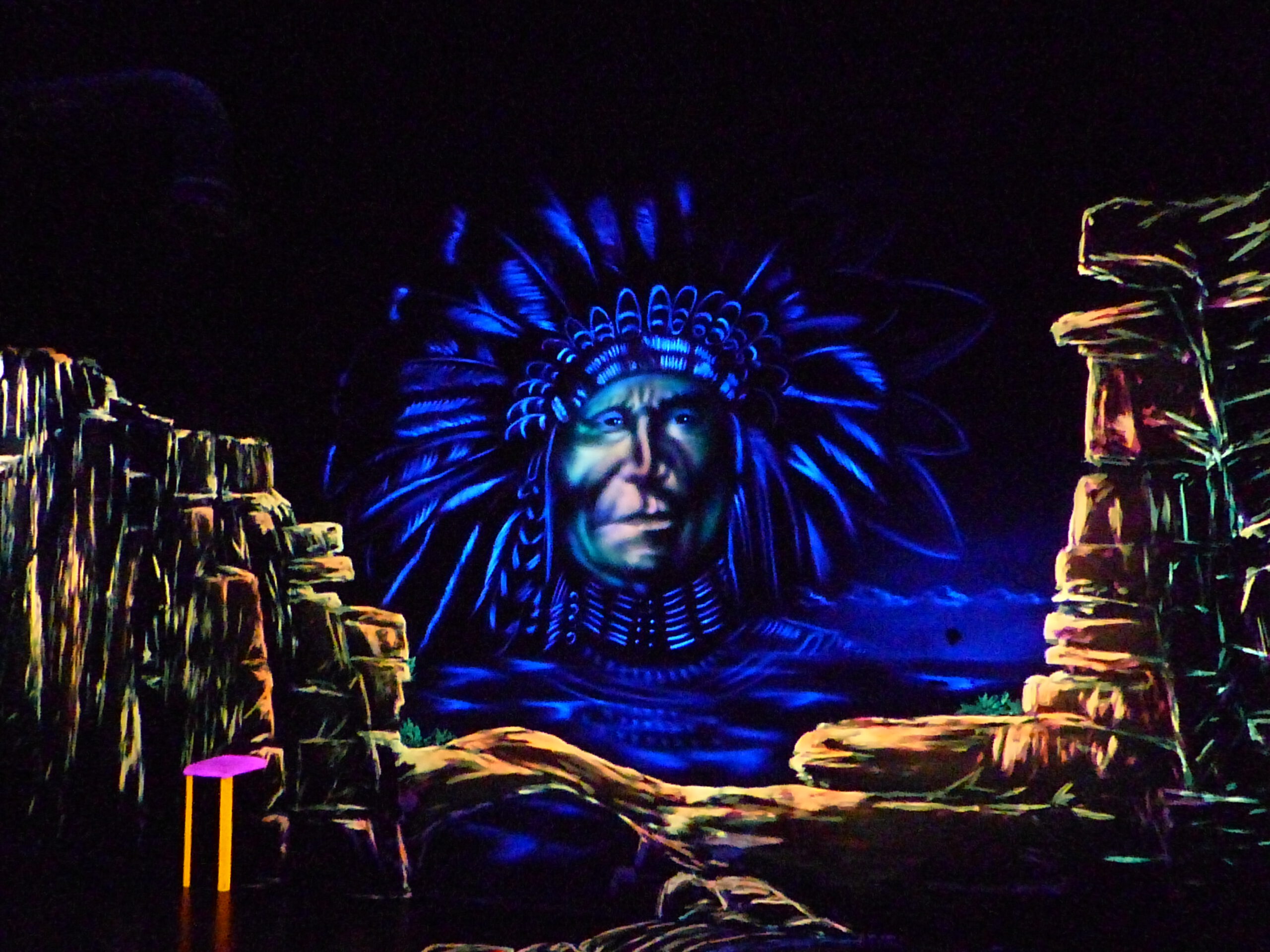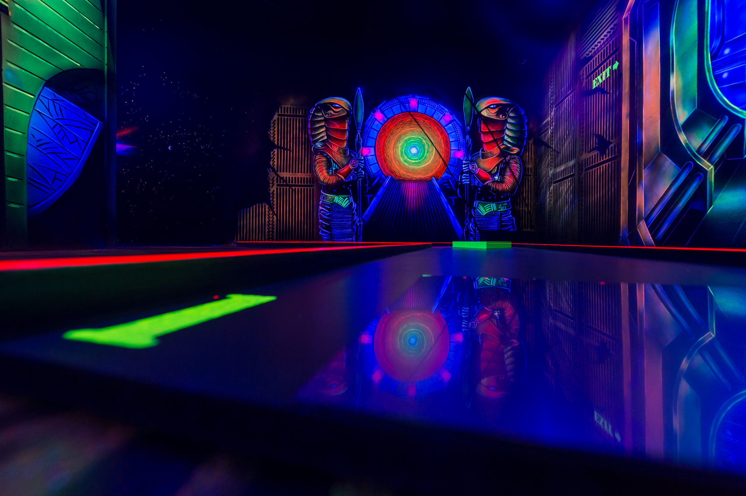 Unsere 18 interaktiven Bahnen, spektakultäre Lichtinstallationen, geheimnisvoll leuchtende Schwarzlichtfarben sowie wunderschöne handgemalte Kunstwerke auf dem Boden und an den Wänden lassen Welten voller Magie und fluoreszierenden Farben entstehen. Der Einsatz unserer 3D-Brillen ermöglicht höchsten Spielspaß und atemberaubende Effekte. Sie sorgen außerdem für ein einzigartiges und spektakuläres 3D-Erlebnis auf höchstem Niveau. Tauchen Sie in eine einmalige, farbenfrohe Welt ein und erleben Sie virtuelle Realitäten, die ihre Fantasie beflügeln und die Räume zum Leben erwecken. Es erwartet Sie ein leuchtendes 3D-Wunderwerk unter dem Motto „Faszinierende Welten“.